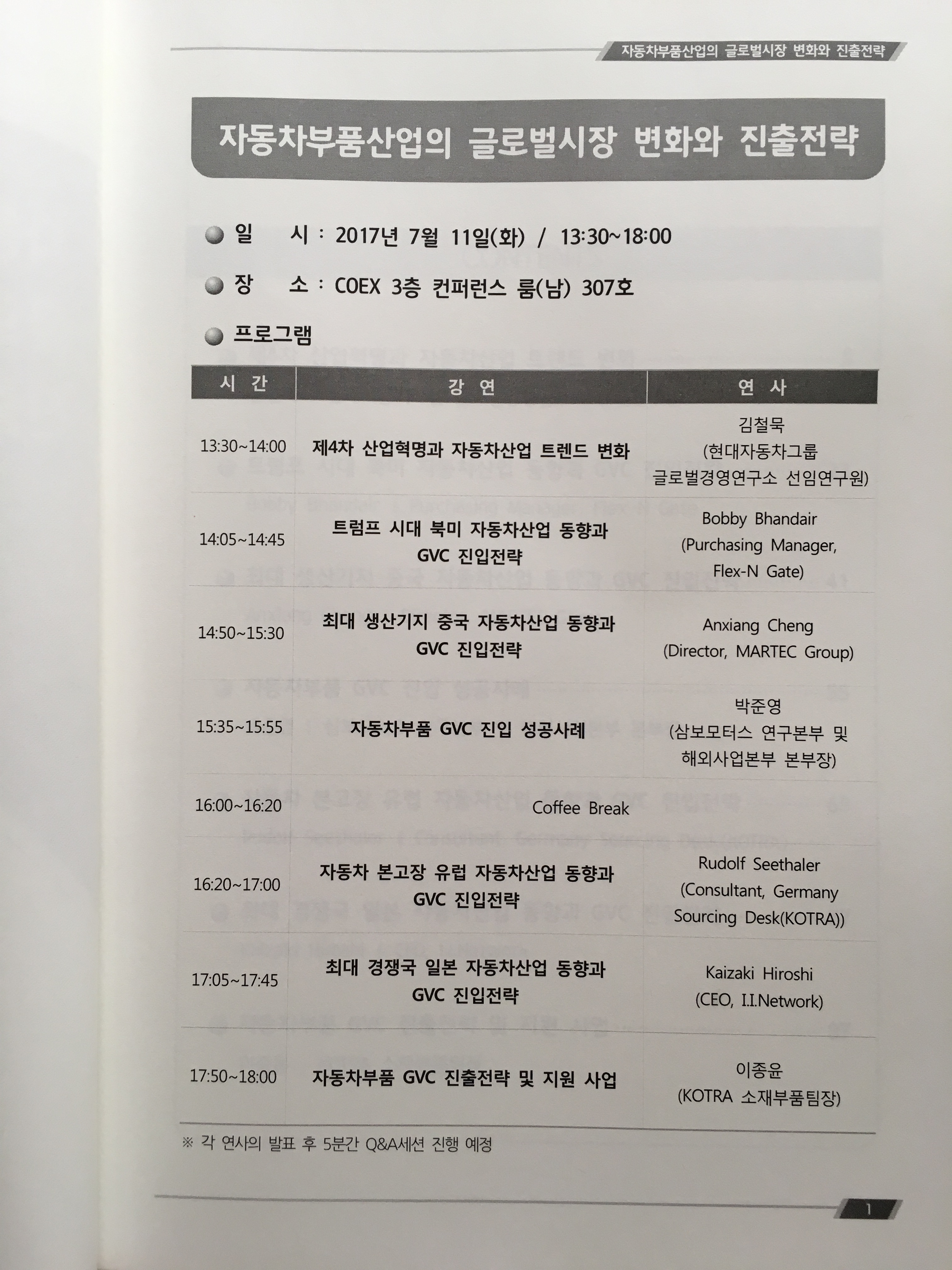 2017年7月11日、ソウルCOEX展示場307会議室にて「自動車産業におけるグローバル市場の変化とGVC戦略」というセミナーが開かれました。