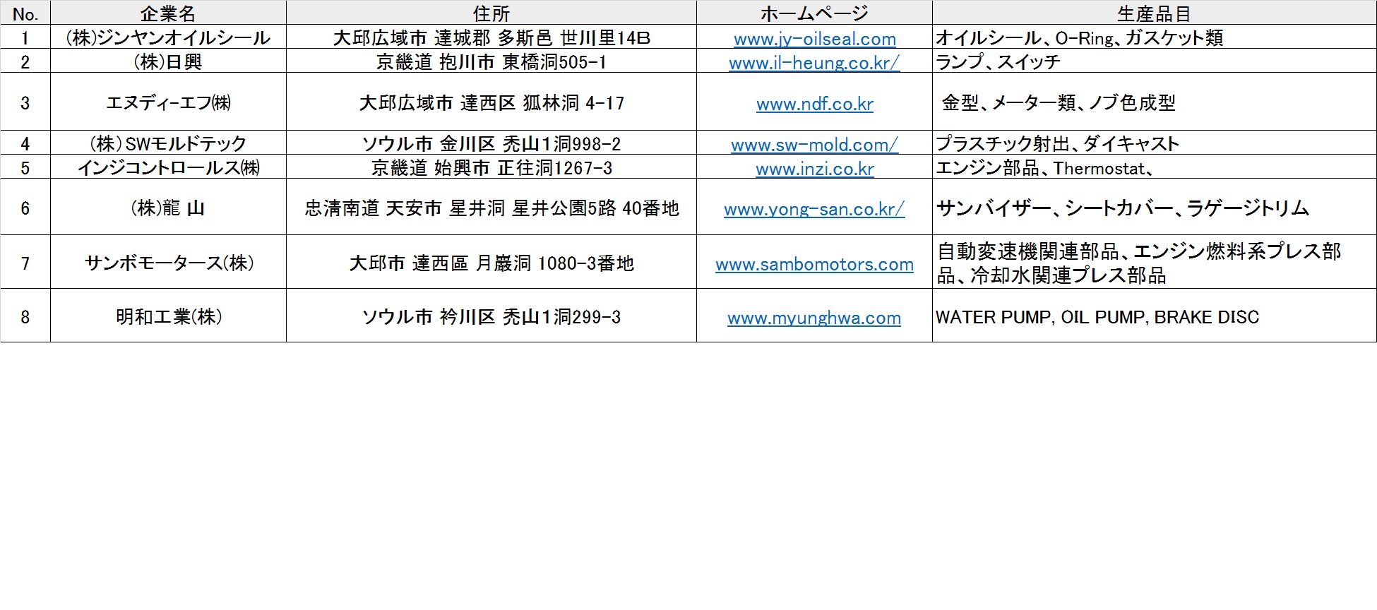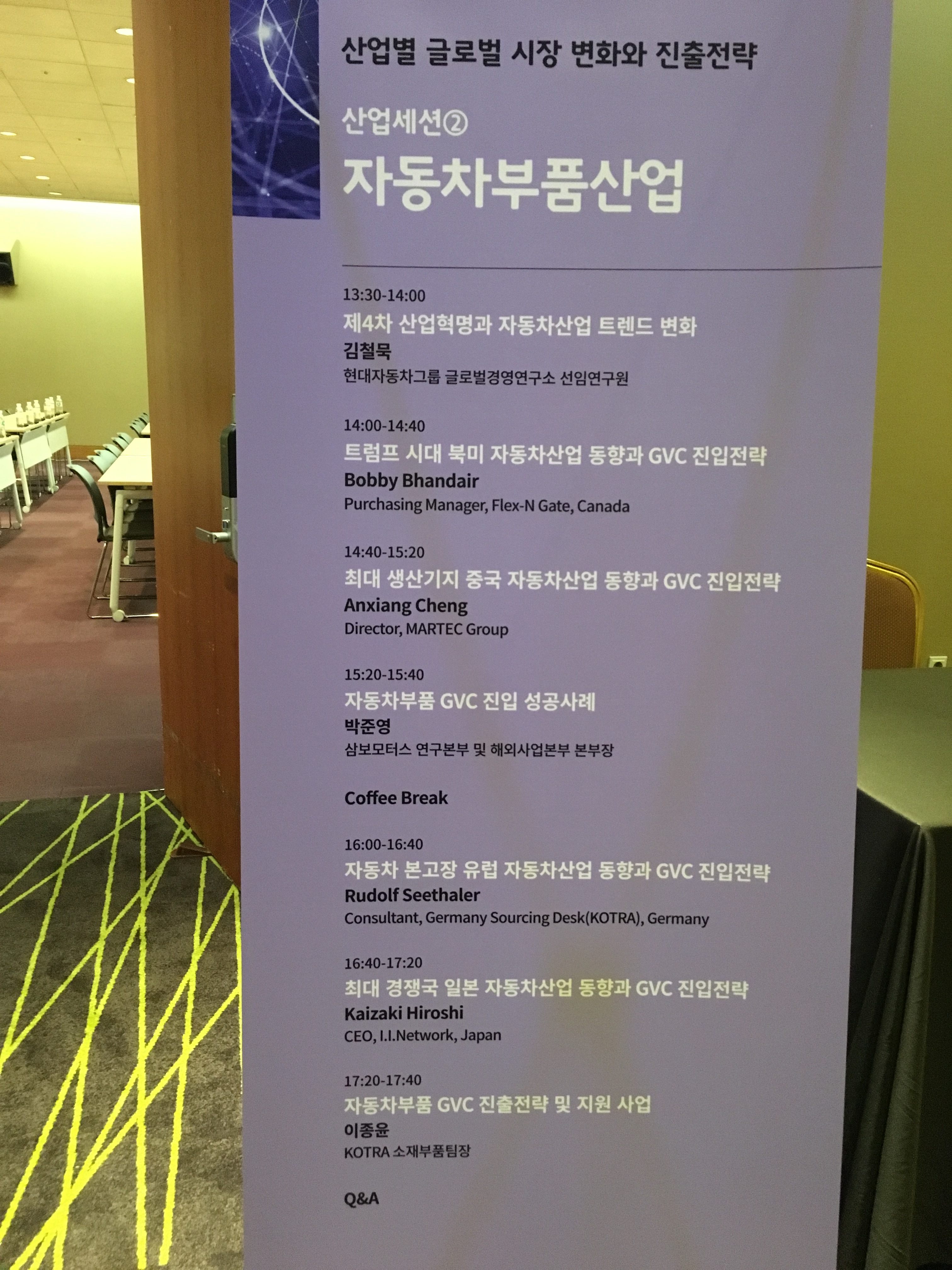 韓国の自動車部品メーカーを対象に、現代起亜をはじめとする韓国自動車メーカーの伸び悩みによる売上不振を打破すべく各国の自動車メーカーに入り込むためのセミナーでした。